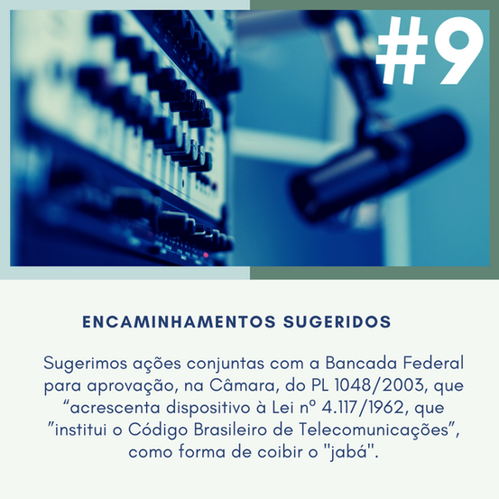 Embora cientes das dificuldades de coibição do “jabá”, prática de difícil identificação e alvo de reduzido número de queixas por parte dos interessados, sugerimos ações conjuntas com a Bancada Federal, objetivando a movimentação, na Câmara, do PL nº 1048/2003, que “acrescenta dispositivo à Lei nº 4.117/1962, que “institui o Código Brasileiro de Telecomunicações”. Destacamos a transcrição parcial da justificativa da proposição, autoexplicativa: “Essa prática favorece quem tem estrutura financeira e prejudica novos artistas (nenhum artista está imune ao “jabá”, é só observar a programação uniforme das rádios), que não possuem, como retaguarda, um grande esquema. Isso contraria o princípio das autorizações, concessões e permissões públicas de radiodifusão, privilegiando a minoria e tornando menos democráticos os veículos de comunicação. A par disso, músicos que gravam em selos independentes, conquanto tenham grande público e vendam muitos discos, acabam não sendo ouvidos nas rádios e TVs, justamente porque não possuem uma grande gravadora pagando por isso”.